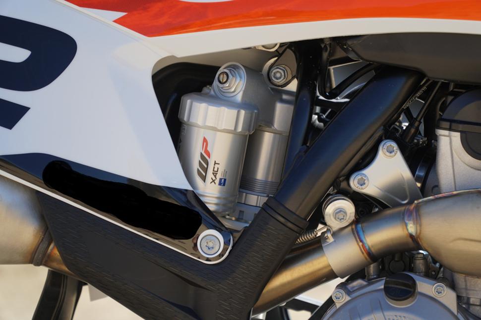 В 2020-ом модельном году вилка и амортизатор KTM 250 SX-F получили новые компоненты и новые настройки. Передняя вилка оснащена теми же поршнями, которые мы видели на KTM 450 SX-F 2020-го года. Они позволяют вилке быстрее срабатывать на отбой, что должно добавить плавности ее работе. Амортизатор так же имеет новые настройки, нацеленные на получение чуть большего комфорта. Единственное изменение, относящееся к силовой установке – это новая крышка воздушного короба с дополнительными вентиляционными отверстиями. И это все. КТМ даже не изменил настройки карт работы зажигания и впрыска 250 SX-F.