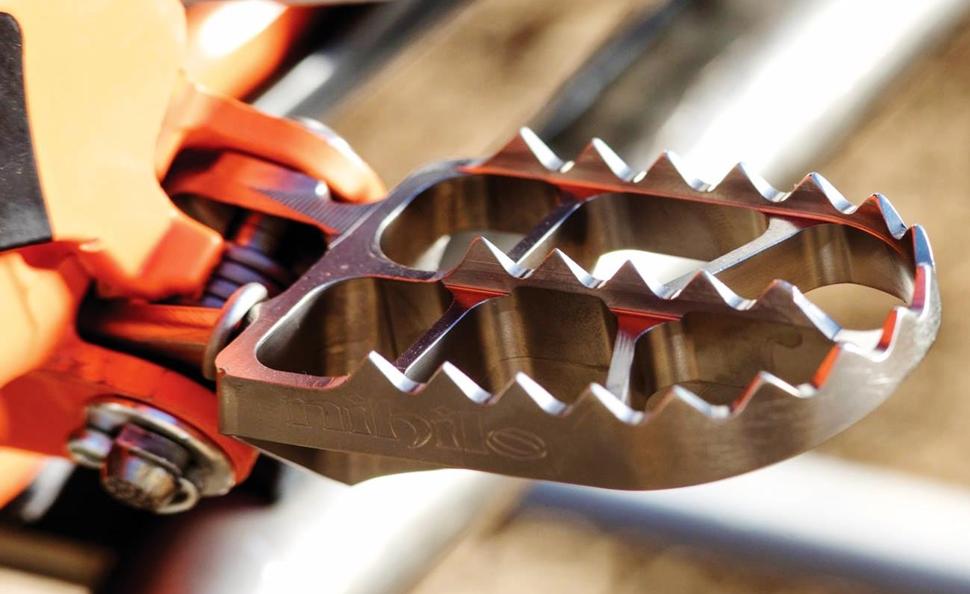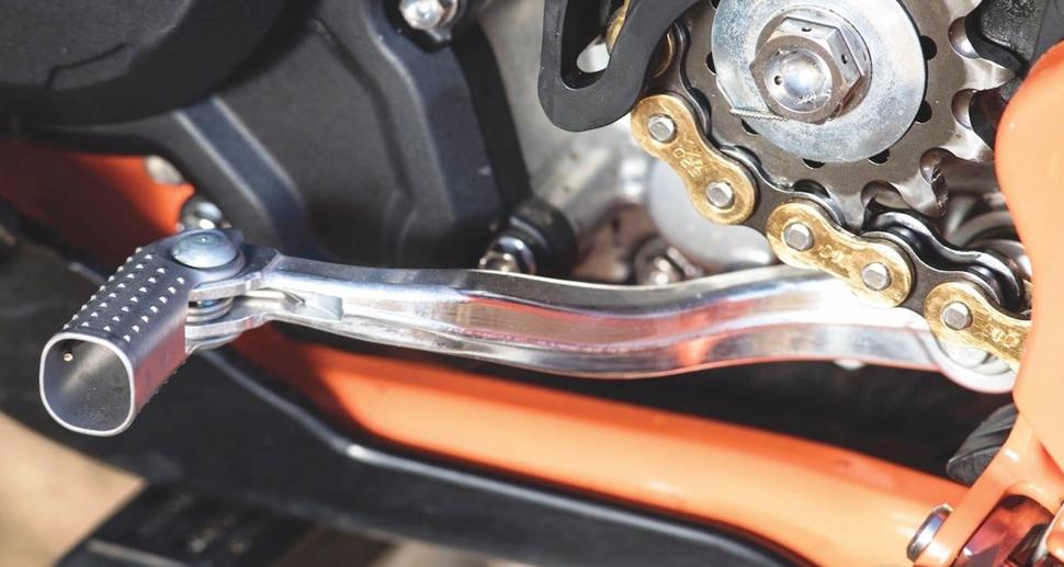 Тестеры попросили Карлоса переставить лапку на зубец, но тогда она оказалась слишком низкой, и под неё плохо заходила нога в кроссовом ботинке. KTM заверили нас, что это стоковые штифт и лапка, так что сначала не поняли, в чём дело, а потом выяснили, что титановые подножки Nihilo ниже стоковых, поэтому и кажется, что лапка оказалась выше обычного.