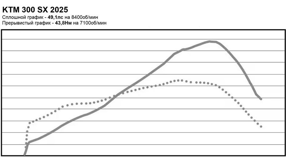 На диностенде KTM 300 SX 2025 года показал пиковые 49,1лс на 8400об/мин и 43,8Нм на 7100об/мин. Для сравнения, это на 1,3лс меньше, но на 7,7Нм больше, чем у KTM 350 SX-F 2025 года. Характеристика тяги кроссового двухтактника сочетает в себе весьма приличные даже на фоне 4-тактной модели низы, отличную тягу на средних, выраженный, но не слишком резкий верховой характер. Однако, после пика тяги этот двигатель ощутимо выдыхается, и с 8500 по отсечку уже не столь эффективен.