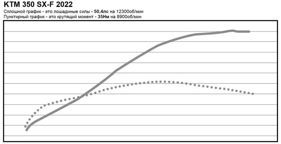 Взять, например, KTM 350 SX-F 2022: снаряжённым он весит 106кг, имеет высоту по седлу 95см, а 250 SX-F лишь на килограмм легче и имеет точно такое же высокое сиденье. При этом KTM 350 SX-F 2022 выдал в пике 50,4лс на 12300об/мин и 35Нм на 8900об/мин.