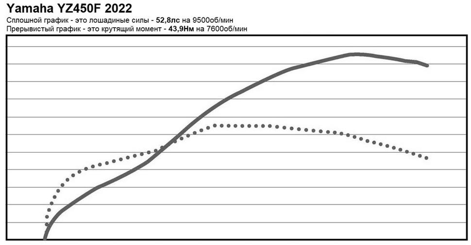 Среди одноклассников, то есть мотокроссовых 450-к, топовый кроссач Yamaha лишь пятый по пиковой мощности. На диностенде Yamaha YZ450F 2022 выдала 52,8лс на 9500об/мин и 43,9Нм на 7600об/мин. Тем не менее, мощности стоковой Yamaha YZ450F более чем достаточно для большинства непрофессиональных кроссменов.