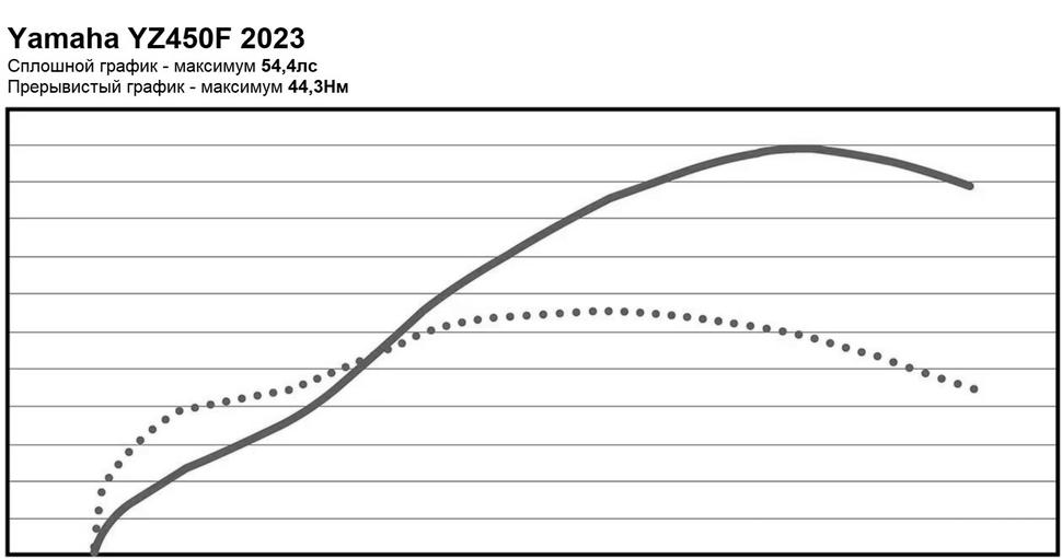 На диностенде Yamaha YZ450F 2023 года, заднее колесо которой было обуто в асфальтовую резину, выдала пиковые 54,4лс и 44,3Нм. Относительно прошлогодней модели оба параметра показали прирост - на 1,6лс и 0,4Нм соответственно.