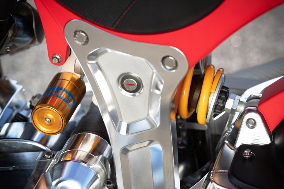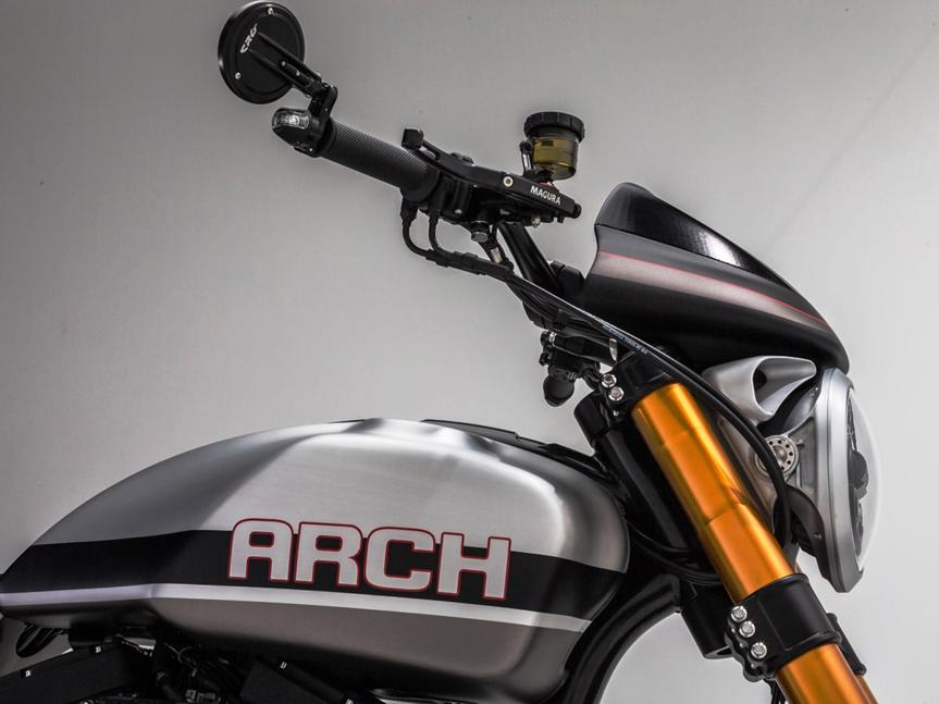 Разработанный и изготовленный в стенах предприятия, фрезерованный алюминиевый маятник гоночного типа увеличивает прочность конструкции и снижает неподрессоренную массу, обеспечивая улучшенное управление и лёгкость езды. Заднюю подвеску мотоцикла дополняет созданный специально для ARCH полностью настраиваемый амортизатор Öhlins. Шасси оборудовано изготовленными на предприятии алюминиевыми боковыми панелями, закрывающими ось нового маятника и обновлённые крепления изоляции двигателя.