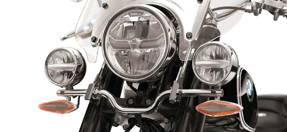 Ветровое стекло BMW R 18 тоже съёмное, крепится к перьям вилки, а к нижним креплениям ветровика присоединена поперечина, на которой установлен дополнительный свет.