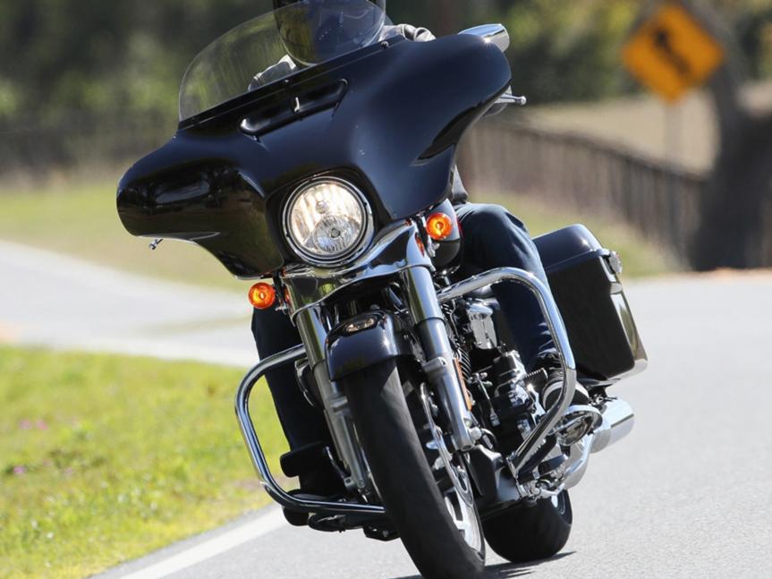 Первый момент я ощутил, когда топнул пяткой для переключения вверх - и пятка провалилась в пустоту. Вместо привычной качельки здесь стандартная лапка под переключение носком ступни. Четыре стрелочных прибора в окружении индикаторных лампочек внутри обтекателя выглядят простецки, как-то уже ожидаешь от нового круизера Harley Davidson большого цветного экрана, и бардачок на его месте неприятно зияет мне в лицо. Низкая и широкая передняя резина требует чуть больших усилий для закладывания в повороты, чем на Street Glide, но зато на прямых участках Standard идёт как по рельсам. С 26 градусами выноса рулевой колонки и 172 мм трейла (теми же, что и на Street и Ultra) он держит дорогу как влитой, даже на шоссейных скоростях. С вилкой Showa Dual Bending Valve и 370 килограммами веса он будто парит над дорогой, даже несмотря на ход задней подвески всего в 5,5 см.