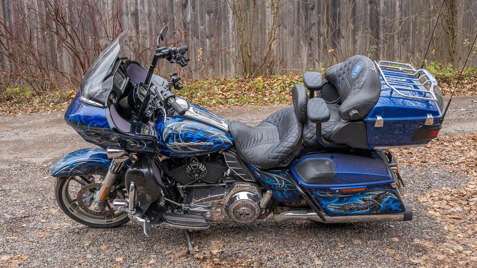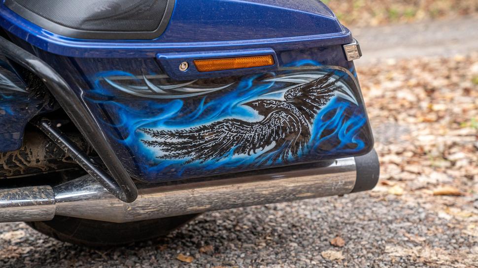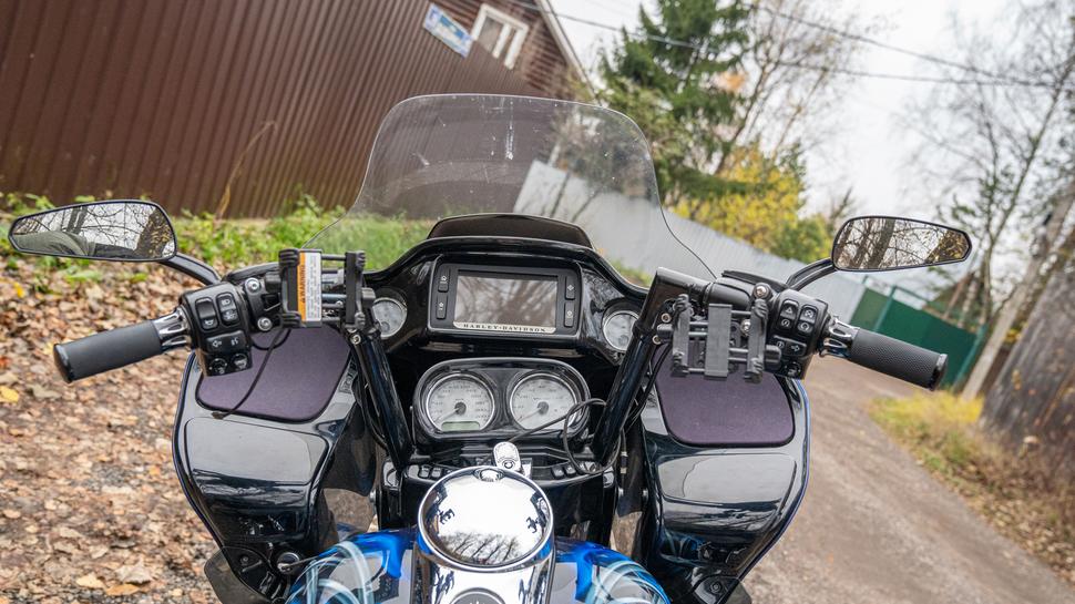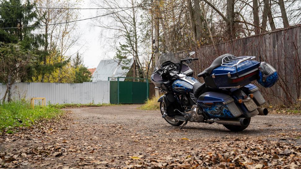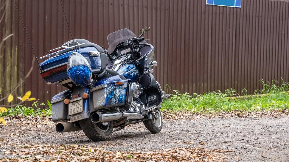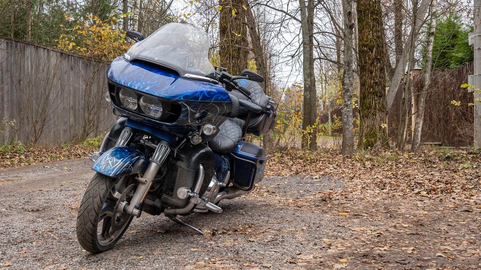 Harley Davidson Road Glide в процессе владения оброс доп. светом, стеклом, аэрографией и серьезными подвесками ёлинз, сиденьем, тур паком, «валенками».