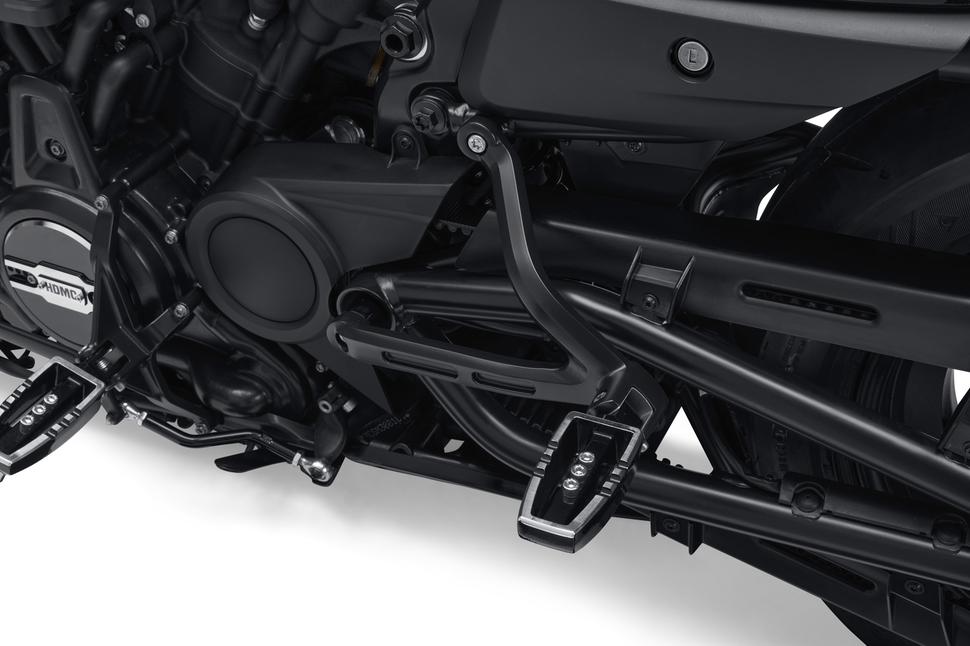 Высота по седлу нового Harley Davidson Sportster S составляет 73см, а углы наклона при этом составляют 34 градуса в обе стороны. В стоке Sportster S оснащён передними подножками, но по каталогу опций для него доступны подножки среднего расположения, а также комплект из пассажирского сиденья и подножек для второго номера.
