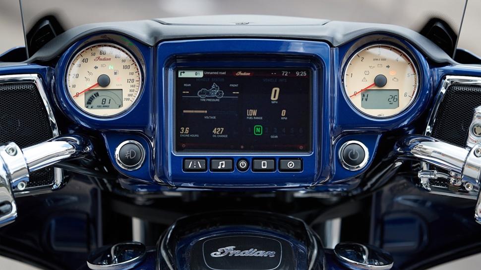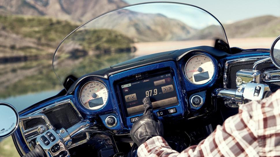 Окрасочный цех приберёг чёрную краску для других моделей, сохранив Classic’у весь возможный хром c двухцветной отделкой элементов из листового металла и панелей корпуса (за вычетом монохромной версии Thunder black, конечно же). Ходовые огни по сторонам от большой круглой фары выполнены заподлицо с массивным передним обтекателем, который сохранил свою конструкцию с прошлых лет, включая большие хорошо видные указатели поворотов в боковых рёбрах. Расположенный над обтекателем управляемый кнопками ветровик позволяет изменять размер воздушного кармана, так что можно направить ветер на шлем, чтобы дать вентиляционным клапанам поработать, или полностью убрать набегающий поток. Внутри обтекателя находится пара аналогоговых циферблатов спидометра и тахометра с маленькими диодными экранами, отображающими прочие цифры. Но самое важное в этой части мотоцикла - проприетарная мультимедийная система Ride Command, представляющая собой семидюймовый сенсорный экран, отображающий навигацию, звуковую систему и информацию о работе систем мотоцикла. Её даже можно настроить на разделение экрана, чтобы получить комбинацию режимов отображения.