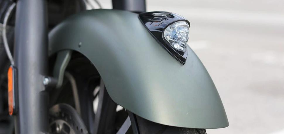 Зато мой Indian Springfield Dark Horse на удивление хорошо соответствует моему вкусу. В смысле, мне не пришлось особо его кастомизировать, за вычетом пары вещей. Первое — это 16-дюймовый быстросъёмный ветровик. Он устанавливается и снимается за пару секунд, а высоты его как раз достаточно для моих 190 см. У него по бокам есть лепестки, отводящие набегающий поток от рук - и я его почти не снимаю, кроме как в особенно жаркие дни.