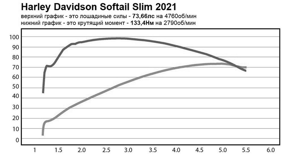 Водружённый на диностенд Softail Slim 2021 года показал пик мощности, равный 73,66лс на 4760об/мин, а график зависимости мощности от оборотов имеет чрезвычайно удобный линейный характер. Кривая крутящего момента начинает рост с 1300об/мин, нарастает до 2790об/мин, достигая пика в 133,4Нм, а затем начинает плавное постепенное снижение с 3000об/мин.