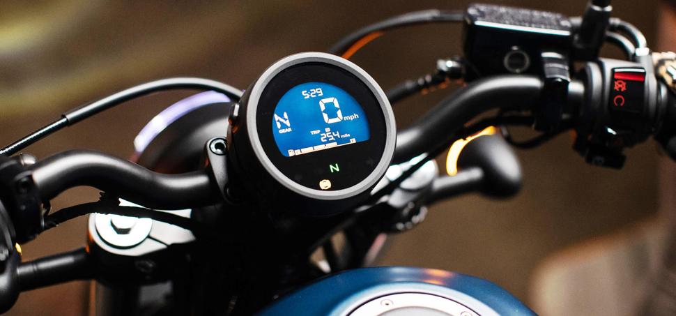 Большая полукруглая ЖК-приборка - ещё одна новинка 2020 года. Она отображает нужную информацию, в том числе часы, скорость, номер передачи и уровень топлива. Правда, здесь не хватает тахометра - странное упущение, на самом деле, для новичкового мотоцикла. Ещё можно переключиться между одометром, двумя трипметрами, средним расходом и текущим расходом. Кнопка переключения на руле, а не на приборке, была бы более удобной, но увы - Honda Rebel 500 - это модель начального уровня. Тем не менее, приборная панель хорошо читается быстрым взглядом.