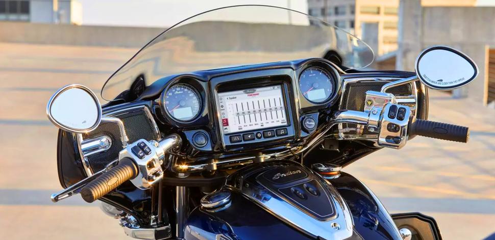 Со 142 литрами багажного объёма Indian Roadmaster Limited (плюс багажник, к которому можно что-нибудь привязать) с собой можно взять не только какао, но и плед с камином. В центральный кофр легко вмещаются два полнолицевых шлема, и все кофры открываются с центрального замка. Бесключевой доступ, электронный газ, круиз-контроль и три режиме езды (Туринг, Стандартный и Спортивный) входят в стандартную комплектацию, но лично мне ни разу не потребовался ни один режим, кроме Стандартного, в котором отклик на ручку газа просто отличный. 7-дюймовая цифровая приборная панель, она же бортовая информационно-мультимедийная система Ride Command, с сенсорным экраном, отзывающимся на нажатия в перчатках, заслуживает самых восторженных отзывов, обеспечивая навигацию, связь с телефоном, мощный звук из четырёх динамиков, и с каждым годом она делается только лучше. В 2020 году Indian устанавливили в неё четырёхъядерный процессор для ускорения работы, добавили интуитивный поиск места назначения, улучшили настраиваемые раскладки экрана и облачные сервисы (в том числе оверлеи пробок и погоды). Добавьте сюда функционал управления смартфоном без рук, и станет ясно, что приборная панель на Indian реализована на высочайшем уровне.