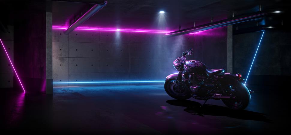 Информации о конструктивных изменениях в моторе пока нет, но визуально двигатель встроен в дизайн: чёрные цилиндры и серебряный картер образуют тот же переход, что и расцветка облицовки. Два чёрных глушителя на чёрных патрубках крепятся на подвесах из неокрашенного алюминия, продолжая ту же идею.