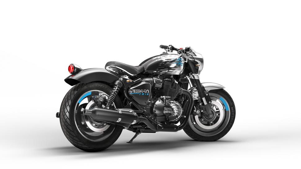 Рама Royal Enfield SG650 укорочена по-бобберному и увенчана одиночным сиденьем на консольном подвесе. Силуэт подрамника разительно отличается от предыдущих двух моделей, а боковые крышки, закрывающие аирбокс, намного более объёмные. Низкий внушительный силуэт подчёркнут пухлыми шинами на необычных почти сплошных колёсных дисках с двумя небольшими вырезами, и даже тормозные диски выглядят нетривиально: во-первых, их крепёжная часть выкрашена в цвет колёсного диска, а во-вторых, они неперфорированные - сейчас такое редко увидишь на заводской конфигурации мотоцикла.