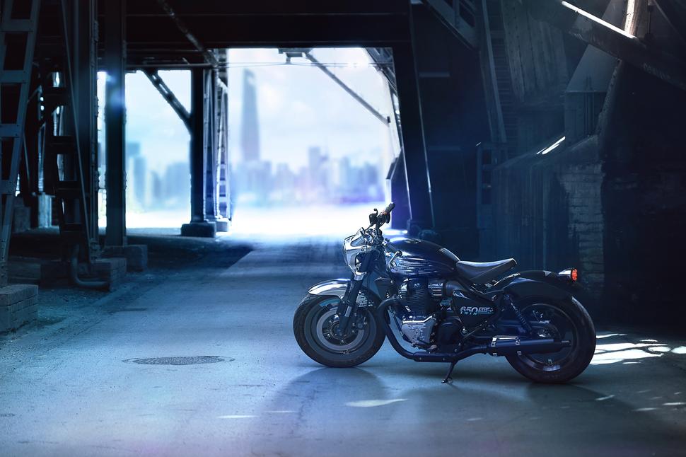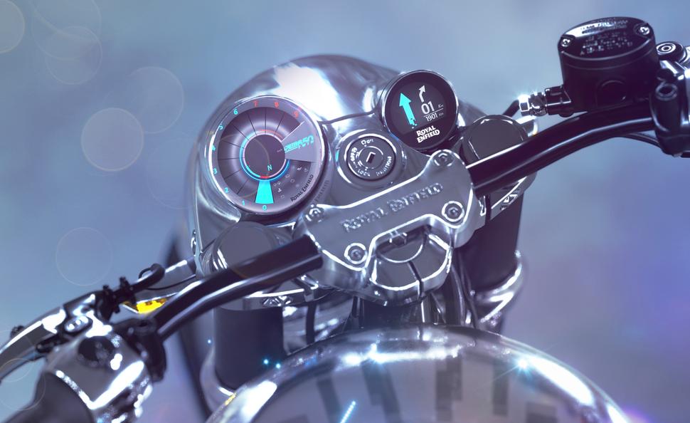 Каждая черта Royal Enfield SG650, от бака до кожуха фары, интегрированного с траверсами, придаёт мотоциклу ощущение скорости. В верхней части кожуха фары органично встроена пара круглых экранов - слева тахометр/спидометр, а справа - компактный мото-навигатор под легко запоминающимся названием Tripper (уже известный по RE Himalayan 2022 года). Практически монохромная окраска, переходящая из серебра спереди в чёрный зад, включает пару бирюзовых акцентов. В целом концепцию дизайна разработчики описывают как "созданную в контексте, а не по требованию" - это кафе-рейсер для одиночки в современных каменно-неоновых джунглях.