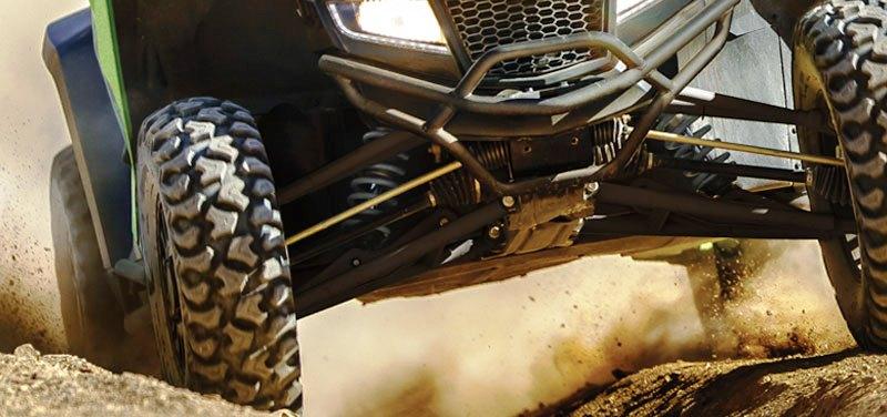 Изумительно. Благодаря вариатору с двумя диапазонами скоростей, Wildcat XX способен ездить по камням намного лучше, чем более спортивный YXZ. Колёса неотрывно следуют за ландшафтом несмотря на торсионы, и он уверенно и цепко проезжает по любым камням, даже гладким и скользким. XX достаточно тяги для езды на 33-дюймовых колёсах, и на нашем тестовом экземпляре клиренс составлял 40 сантиметров до защитных пластин. Полудвери и агрессивные шины позволяют ему отлично ехать и по грязи, но скорей всего любители такой езды захотят установить брызговики и крышу.