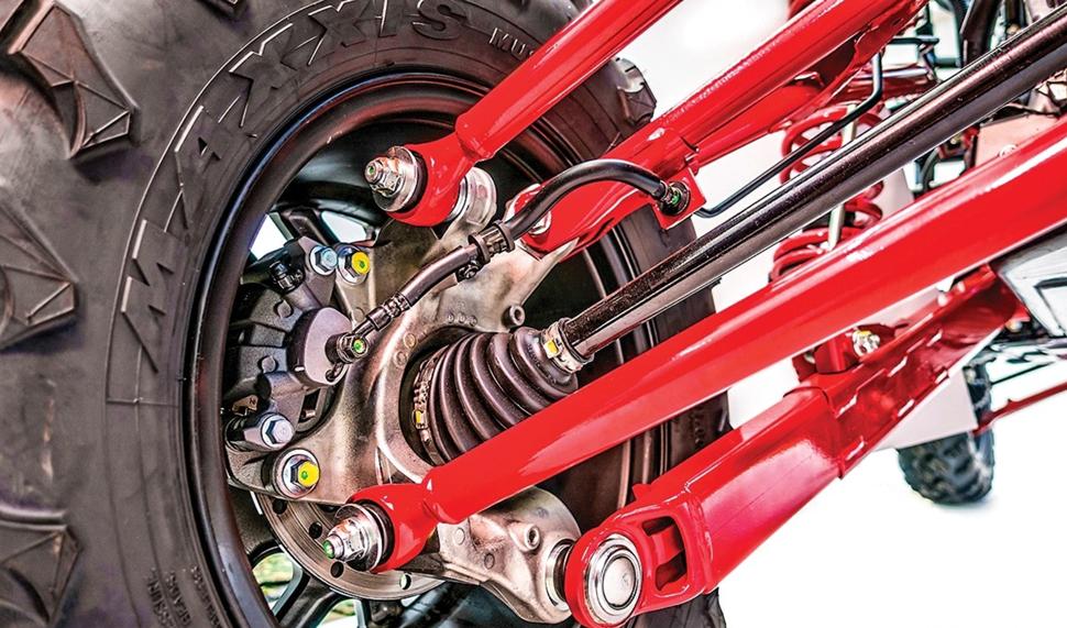 Honda ставит герметичные втулки в А-образные рычаги подвески. На Yamaha YXZ1000R SS существует возможность их щприцовки. После почти 1500 километров пробега ничто на квадроциклах не болается и не скрипит. Нам пришлось заменить один задний пластиковый защитный экран на рычаге Yamaha YXZ1000R SS. Пластик раскололся во время теста на камнях. Мы считаем, что такие защитные приспособления обязательны для всех квадроциклов.