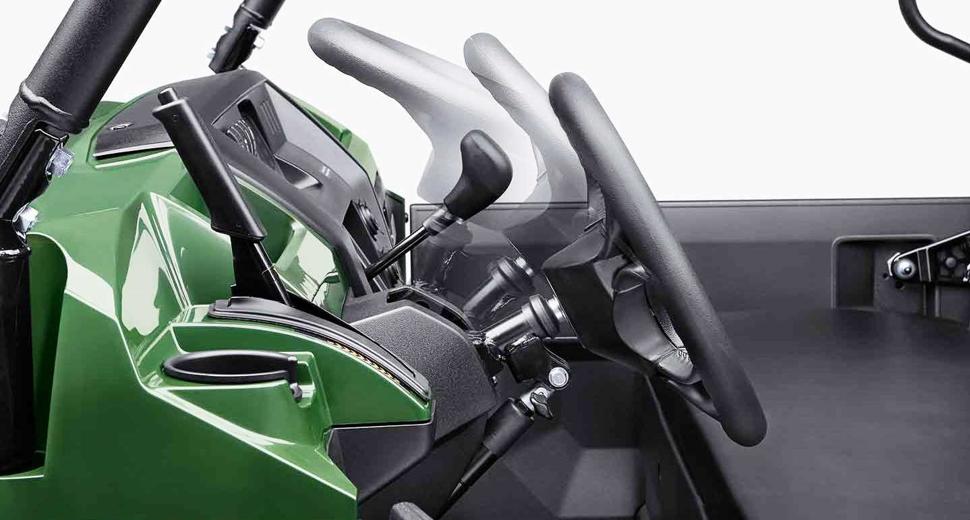 Рулевое управление оснащено электроусилителем руля, обеспечивающим полный комфорт длительного управления и снижающим усталость водителя. Степень усиления зависит от скорости езды, поэтому управление Mule pro-dx diesel остаётся точным и лёгким, с минимальной отдачей в любых условиях. Регулируемый руль поставляется в стоковой комплектации.