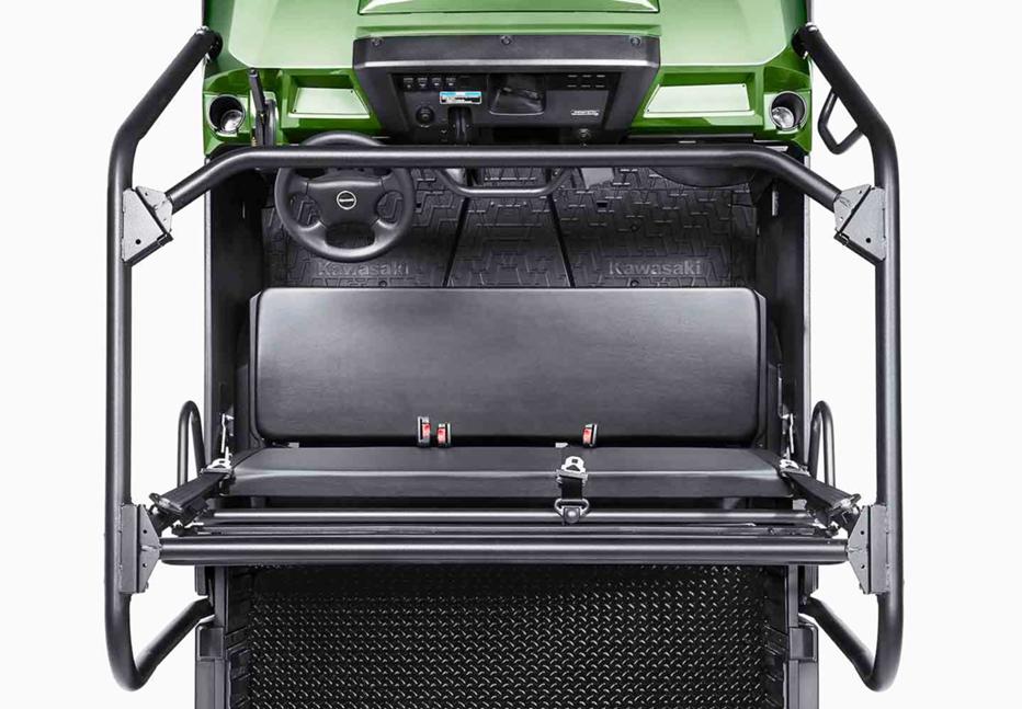 В кабине Mule pro-dx diesel установлено мягкое сплошное сиденье, на котором с комфортом разместятся три взрослых человека. Трёхточечные ремни автомобильного типа удобны и просты в использовании. Под сиденьем находится грузовой отсек на 50 литров.