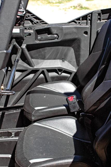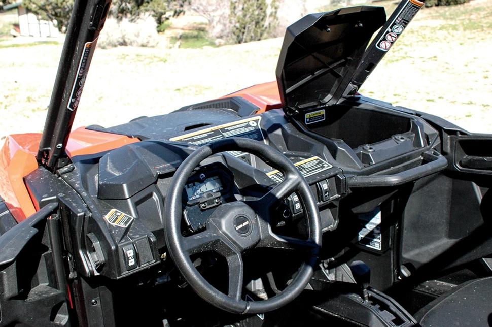 КокпитCan Am Maverick Sport Max выглядит красиво. При езде не слышно нежелательных шумов двигателя, трансмиссии и подвески. Двери этого четырехместного квадроцикла защищают от грязи и воды, а благодаря резиновым уплотнениям они не гремят на ходу. Оба передних сиденья имеют регулировки по длине. Людям до 180 сантиметров ростом достаточно места спереди, а задние сиденья вполне просторны, чтобы быть удобными для взрослых. Для водителя и пассажира предусмотрены закрывающиеся перчаточные ящики, а также подстаканники. Воздухозаборники двигателя и трансмиссии расположены высоко, а воздушный фильтр имеет легкий доступ. Механизм сцепного устройства прост в использовании. Хотелось бы больше защиты от брызг и грязи, но мы можем сказать то же самое относительно большинства других спортивных UTV. В качестве опции Can Am предлагает расширители крыльев.