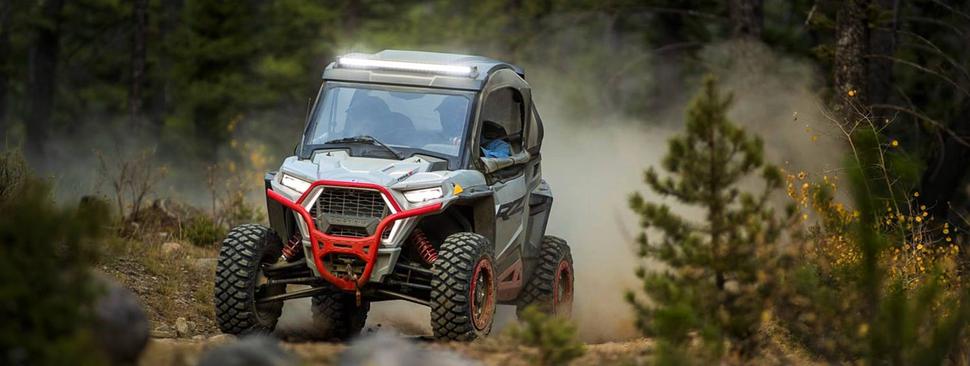 - Особенности RZR Trail Ultimate: Система Ride Command, акустическая система Rockford Fosgate Audio, полимерная крыша, режим Turf системы VersaTrac, амортизаторы FOX 2.0 Podium X