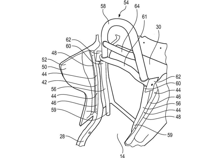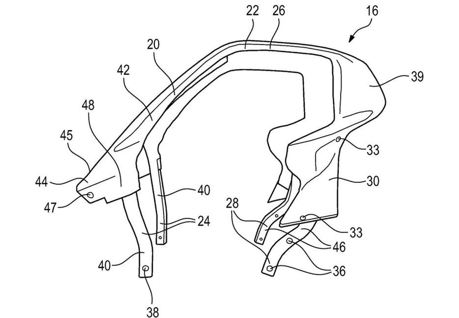 В районе крепления карбоновых дуг спереди и сзади находятся четыре сминаемые секции (под номером 40 на эскизе), предназначенные для уничтожения при аварии. Они поглощают ещё больше энергии, позволяя крыше чуть проседать при падении на неё. Эти элементы крепятся к каркасу крыши на болтах и легко меняются при выходе из строя, так что мотоцикл в случае ДТП совершенно не обязательно окажется сильно повреждённым.