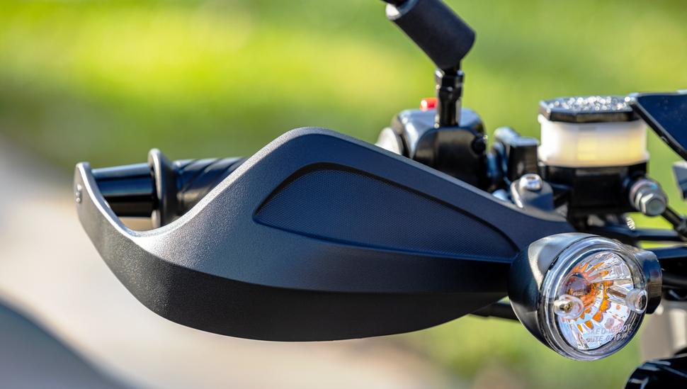 Передний щиток тоже скорее узкий, но благодаря небольшому ветровичку и симпатичным гардам (защите рычагов и кистей), скутер обладает некоторой ветрозащитой. По крайней мере, на 80км/ч сдувает не сильно, а этой скорости вполне достаточно для города.