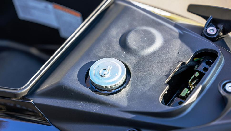 Моторчик едва завёлся, и пока не прогрелся, довольно активно постреливал в глушитель. Но и даже тогда отклик на газ был каким-то вялым… Знакомые симптомы, не правда ли? Вскрываем кожух двигателя на дне подседельного кофра, и вот он, карбюратор, смотрит прямо на вас, удерживаемый двумя крестовыми винтами. Дальше всё по классике: снимаем дроссель, поднимаем иглу на полмиллиметра, чтобы она пропускала чуть больше топлива, собираем обратно. Прохладный воздух намного плотнее, от этого смесь делается беднее и даёт меньше тяги, отсюда и слабый отклик. Некоторые считают, что через основной жиклёр топливо на холостых не идёт, но это совершенно не так, ведь игла его вовсе не перекрывает в нижнем положении, да и сами холостые обороты в таких простых карбюраторах задаются некоторым открытием дроссельной заслонки при помощи ограничительного винта.