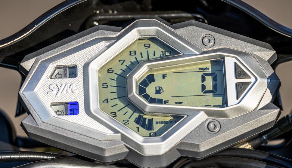 Приборная панель у Lance Cabo 125 выполнена в лаконичном, но футуристичном стиле. Несколько фрагментов монохромного ЖК-дисплея разделены металлическим обрамлением, на котором, кстати, вытиснено лого SYM. Тут имеется трипметр, шкала уровня топлива, упомянутый уже тахометр (размеченный до 10000, но отсечка наступает где-то на 8500). На левой части переднего щитка имеется USB-гнездо для зарядки.