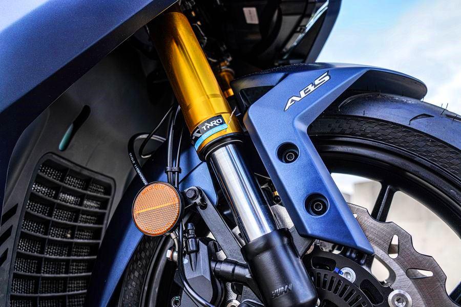 Скутер оснащён перевёрнутой вилкой Yu’an, отключаемой ABS, регулируемыми рычагами тормоза на руле, а также грипсами с подогревом. Регулируемый ветровик эффективно отводит набегающий поток, снижает шум ветра на высоких скоростях и повышает устойчивость скутера. Пульты на руле TARO TR400 оснащены голубой подсветкой и отлично читаются в темноте. Кроме того, TR400 оснащён системой бесключевого доступа с передовой технологией шифрования.