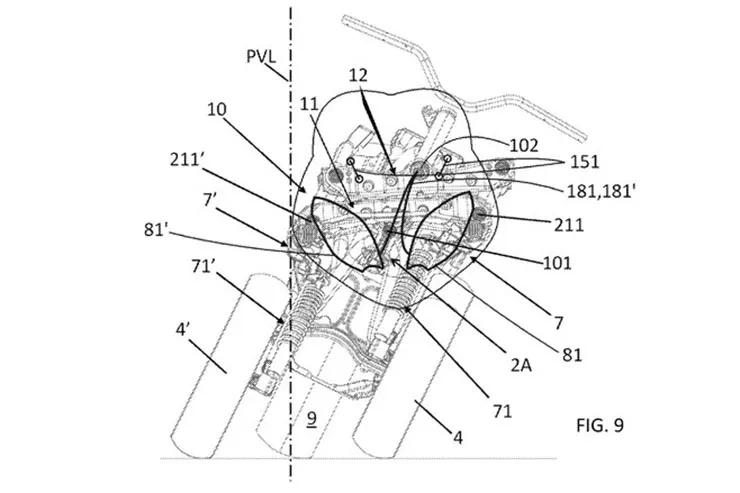 На Piaggio MP3 и большинстве других наклонных трициклов отдельные подвески двух передних колёс установлены в параллелограммном механизме над колёсами. Этот механизм состоит из двух горизонтальных балок, которые всегда остаются параллельны дороге, а расстояние между ними изменяется в зависимости от наклона. Патентная заявка Piaggio предлагает крепить передний обтекатель к этим балкам, а не к основному шасси мотоцикла, так, чтобы и он тоже оставался всегда в одном положении относительно дороги. Благодаря этому обтекатель не потребуется устанавливать высоко, и он сможет оставаться над передними колёсами, когда они наклоняются под ним. Это значит, что основная часть воздуха, который раньше проходил между передними колёсами и “парусил” об корпус скутера, теперь будет перенаправлена вверх и в стороны от скутера, и лишь небольшой поток будет обдувать радиатор, как на обычном двухколёсном мотоцикле.