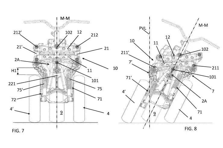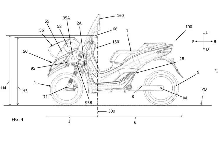 Документ иллюстрирует и описывает новую версию MP3, в которой используется то же наклонное трёхколёсное шасси, что и на протяжении 15 лет существования этой серии, но передний обтекатель скутера при этом остаётся вертикальным даже тогда, когда шасси наклоняется. Такое изменение конструкции достаточно просто реализовать, но оно может улучшить как внешний вид, так и аэродинамические характеристики скутера, и всё это с минимальными дополнительными затратами на компоненты и научно-исследовательские и конструкторские работы.