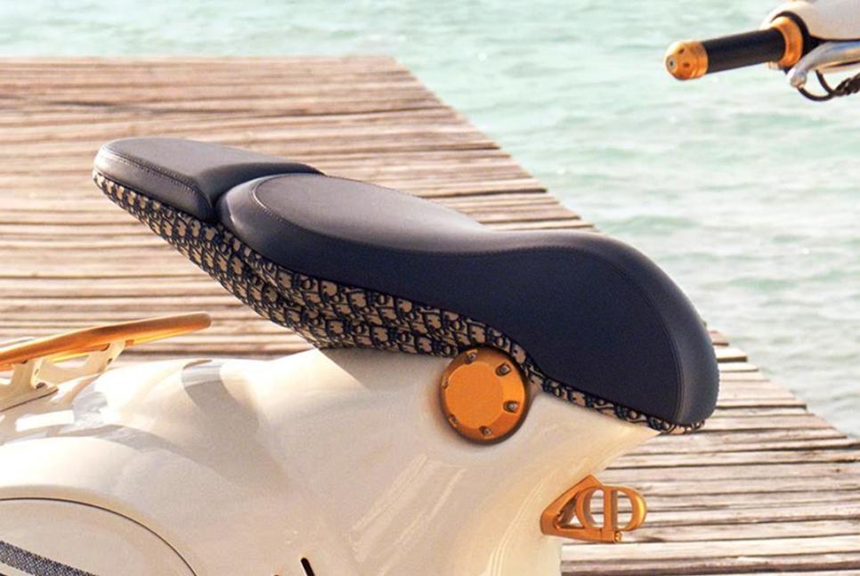 Основанный на легендарной модели 946, Vespa 946 Christian Dior красуется уникальной цветовой схемой и рядом модных аксессуаров в самом прямом смысле: к примеру, центральный кофр в стиле дорогого дорожного кейса, оформленный узнаваемым орнаментом Dior Oblique вместе с сиденьем. В таком же оформлении доступен шлем и ряд багажных аксессуаров.
