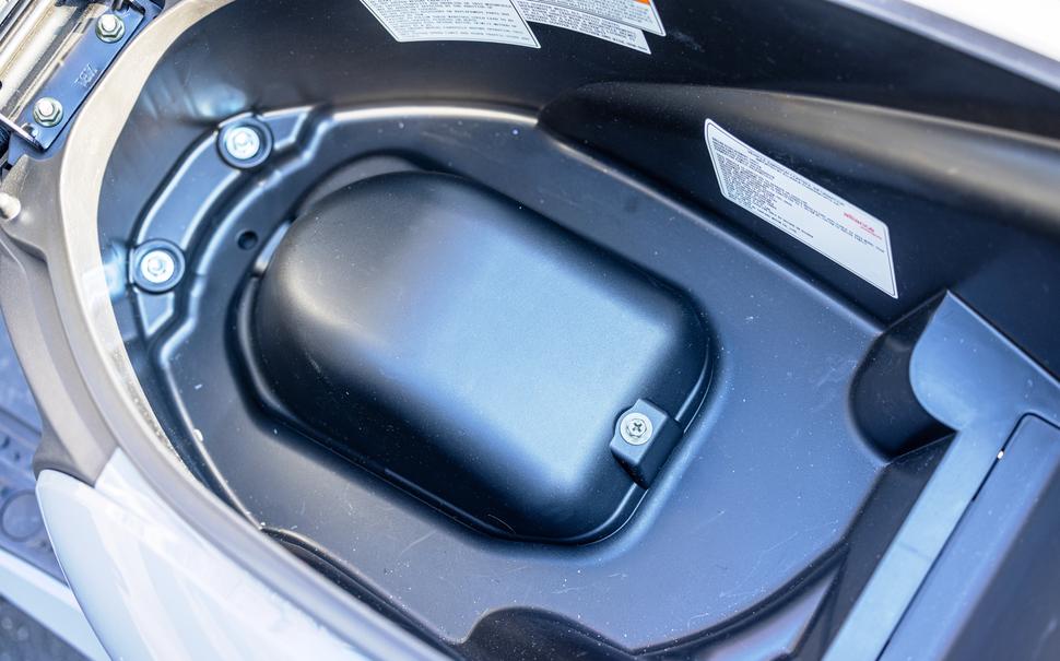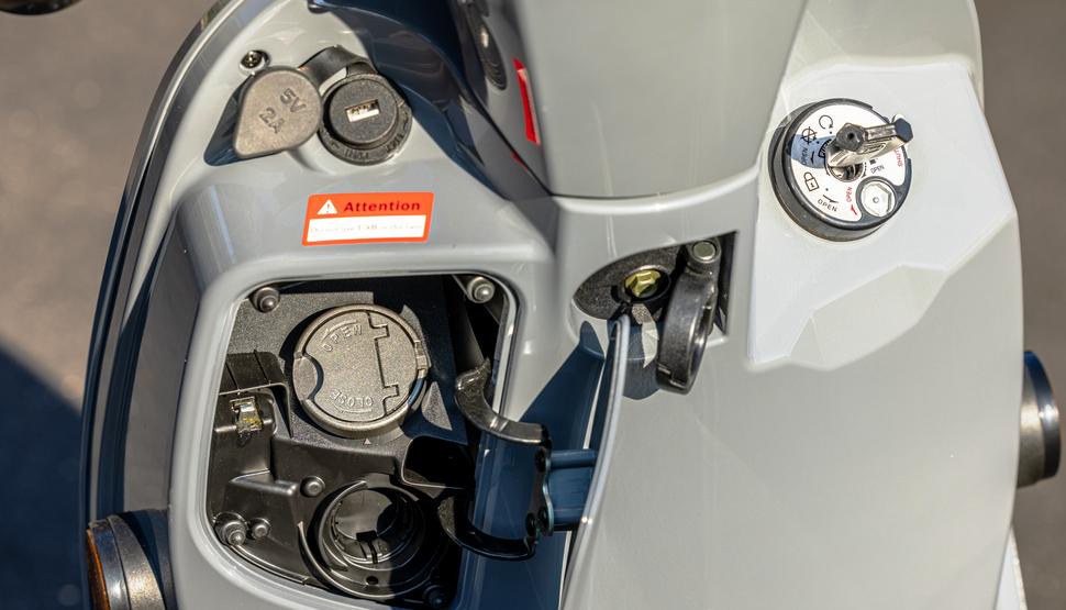 Поворот утопленного ключа влево открывает сиденье, под которым достаточно места для хранения пары сумок с продуктами или рюкзака и пакетика фастфуда. Будьте осторожны, чтобы седло не упало и не прищемило вам руки, потому что газовой стойки у него нет. Благо, что сиденье хотя бы спокойно стоит в полностью открытом состоянии, если, конечно, руль находится в центральном положении. Под седло вмещается открытый шлем размера L, но полнолицевой уже не влезет. Благо, что в передней части сиденья, прямо рядом с шарниром, есть два крючка для шлема.