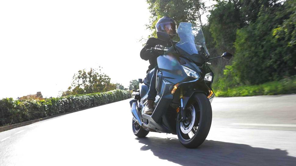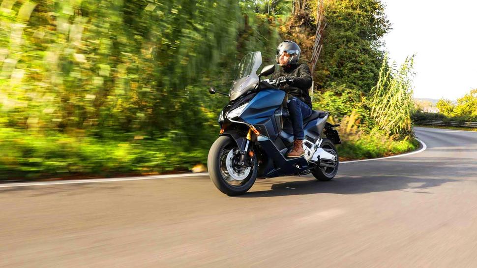 Но главные умения Большой Forz-ы, конечно, раскрываются за городом. Мощный двигатель, удобное управление тягой, неплохое шасси, 17-е переднее колесо, обутое в 160-ю шину в сочетании с тормозной системой, внушительной, но не агрессивной, позволяют управлять скутером с той же точностью, с какой управляются хорошие мотоциклы.