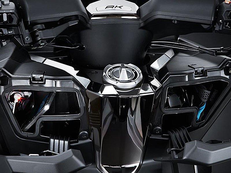 Дизайн Kymco AK550 шикарный. Вот, что первое приходит в голову, когда видишь этот "АК". Начиная с широкого переднего обтекателя со сложным ломаным дизайном, продолжая парными фарами, убранными под "бровь", заканчивая регулируемым ветровиком. В низ обтекателя, сделанного на манер спорт-байков, убраны поворотники.