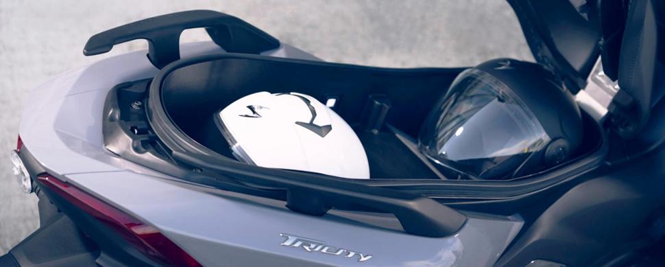 Кроме динамичной внешности, Tricity может похвастаться и весьма немалой практичностью на фоне соперников. Подседельный кофр вмещает два полноразмерных шлема или один такой шлем и небольшой чемоданчик, а в самом отсеке установлен диодный осветитель. Топливный бак и сиденье открываются нажатием кнопки, а на передней панели находится гнездо прикуривателя. Трёхколёсный скутер Yamaha Tricity 300 оснащён системой бесключевого доступа Smart Key - достаточно иметь беспроводной ключ в кармане, и большинство операций доступны при помощи главного переключателя: включить/выключить зажигание, запустить/остановить двигатель, снять блок руля, открыть сиденье или крышку бака можно не вставляя ключ в замочную скважину.