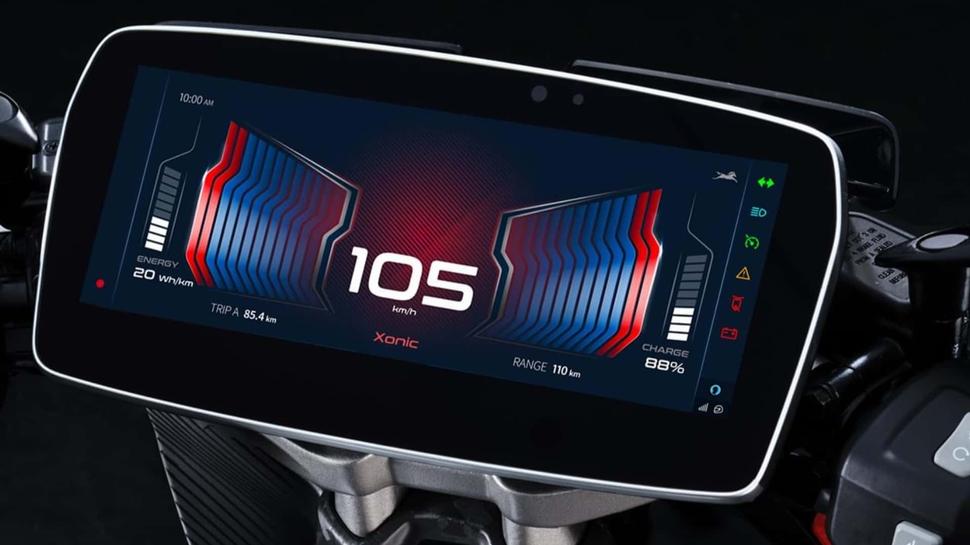 Что касается технологий, то новый TVS X оснащён довольно мощным электромотором, встроенным в задний маятник. Он выдаёт 11кВт (около 14,3лс) и способен разогнать скутер до 105км/ч. Благодаря электротяге он набирает 40км/ч всего за 2,6 секунды. Любопытной особенностью этого электроскутера является инерционный воздухозаборник, направляющий прохладный набегающий поток к электромотору для охлаждения. Электронный контроллер TVS X имеет три режима езды: Xealth, Xtride, and Xonic.