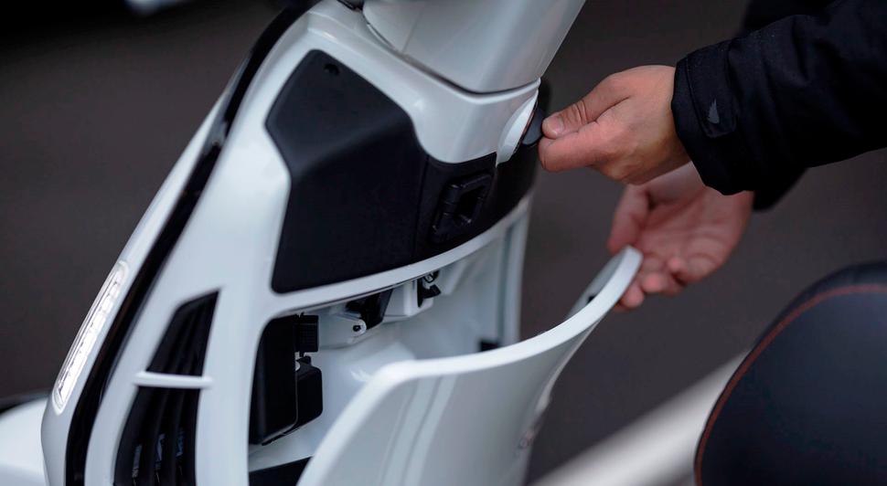 Бесключевой доступ на мототехнике - это штука неоднозначная. Необходимость куда-то надёжно прятать брелок во время езды напрягает, потому что из карманов куртки содержимое нередко вылетает на ходу. Vespa об этом позаботилась, установив спереди небольшой бардачок, куда можно положить беспроводной ключ вместе с телефоном, а заодно подзарядить его от находящейся там розетки.