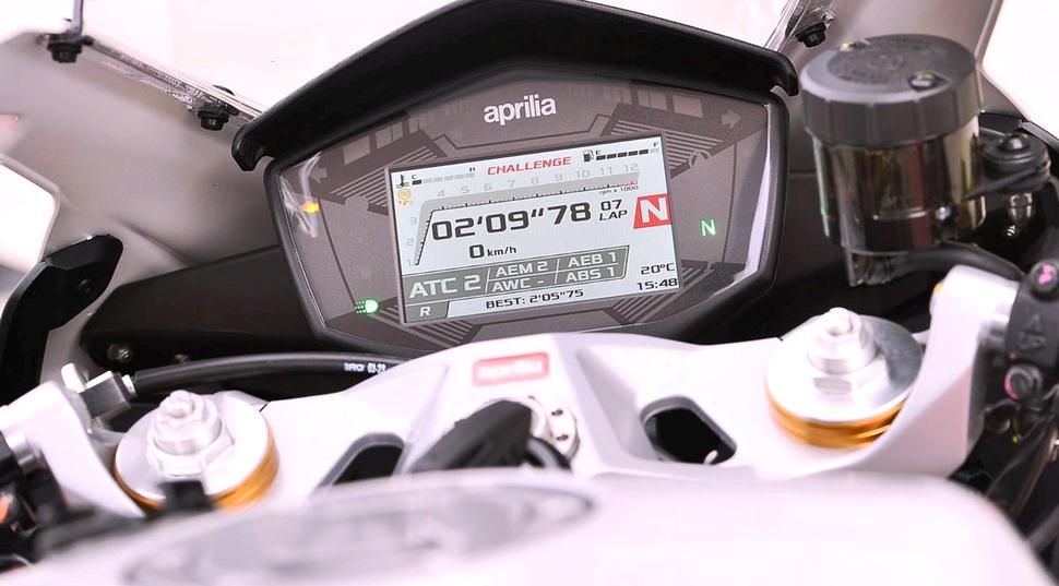 Режим езды Challenge (Вызов) в Трековом комплекте даёт сильный, но не слишком резкий подхват с закрытого газа на выходе из крутых поворотов, и даже в специально разработанном режиме езды Time Attack (Атака Времени), который Aprilia придумала именно для этого тестового мотоцикла, отклик на газ был более резким, но всё же управляемым. Эти режимы, более спортивные по сравнению с Динамичным режимом в Дорожном комплекте, дают возможность насладиться чётким ускорением и приятной тягой на открытии газа, особенно на третьей-четвёртой передачах. Аккуратный подхват и система управления торможением двигателем позволяют использовать его возможности максимально эффективно в любых условиях: он приятно отзывчив, когда хочешь ехать жёстче. На 160км/ч мотор крутится всего на 7500ою/мин, то есть на двух третях от максимальных оборотов. Это превосходный мотоцикл для трек-дней, который на извилистой трассе сожрёт и не подавится тяжёлый литровый супербайк под райдером среднего уровня, и при этом доставит массу удовольствия своему водителю.