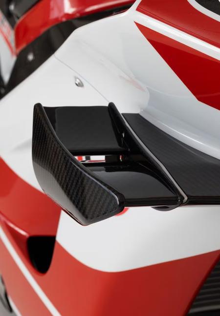Вся облицовка, судя по всему, изготовлена из карбонового композита, а аэродинамические крылья, согласно пресс-релизу, "способны автоматически поддерживать оптимальный угол в любое время". Они активные или полуактивные? В любом случае, их использование на WSBK-шном мотоцикле допускается, если точно такие же крылья стоят на серийной дорожной версии.