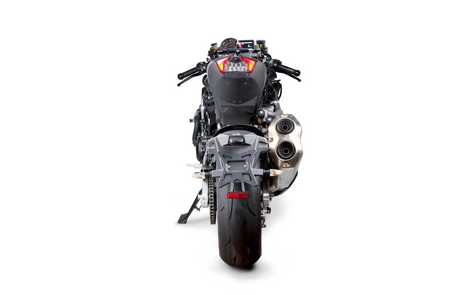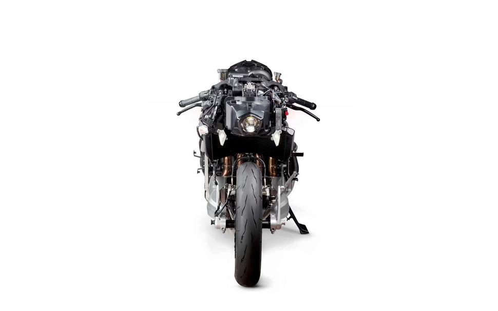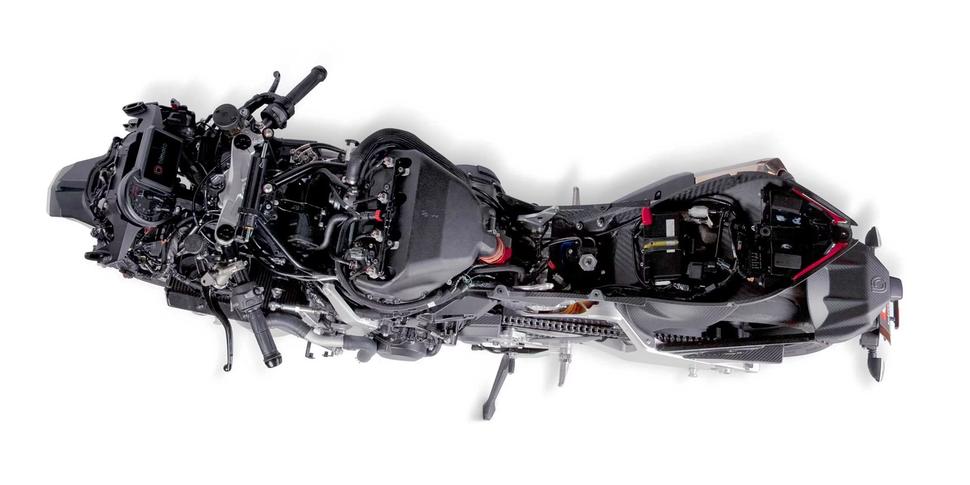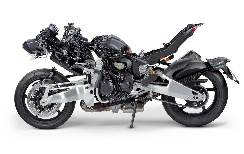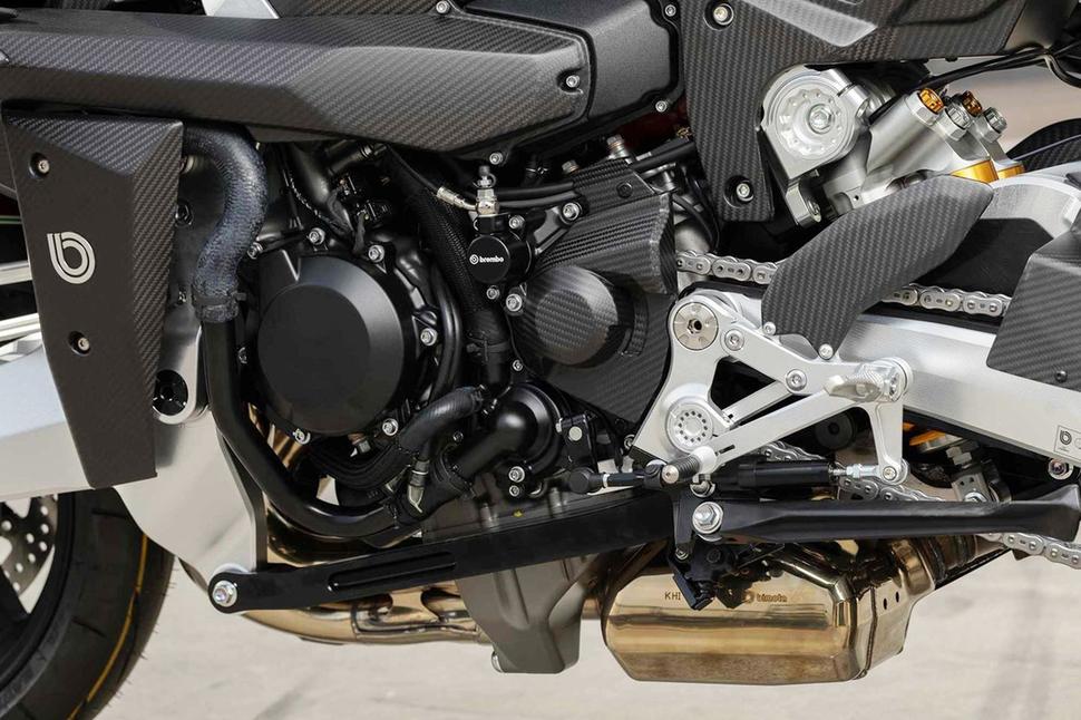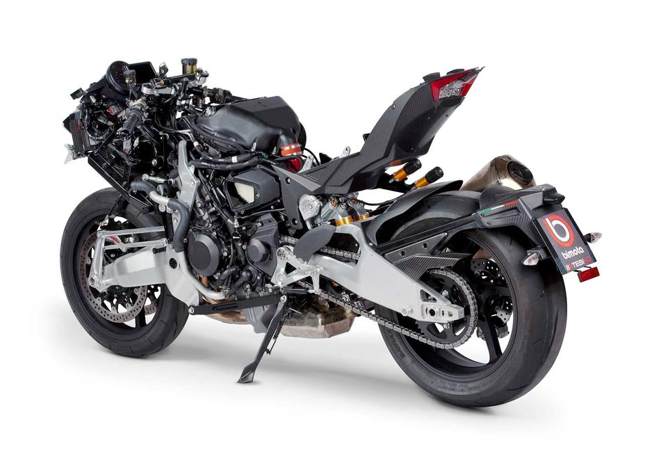 С ключом от склада Kawasaki Bimota смогли взять один из самых мощных в мире серийных моторов вместе с топливной и выхлопной системой, приборной панелью, пультами, светотехникой и электронными ассистентами, и скрестили всё это со своими шасси, ходовой частью и облицовкой. Разумеется, на нём стоит фирменное рулевое управление на центральной поворотной ступице типа Difazio, спроектированном Пьерлуиджи Маркони в 80-х и запущенном в производство в 1991 году, а также фрезерованный алюминиевый задний маятник и карбоново-алюминиевые передние рычаги, крепящиеся непосредственно к мотору Kawasaki. Рамы как таковой здесь нет вообще. Облицовка, кстати, представляет собой произведение искусства из карбонового композита, она украшена аэродинамическими крыльями, дающими до 11кг прижимного усилия. Благодаря использованию лёгких материалов, снаряжённая масса мотоцикла составляет 219кг.