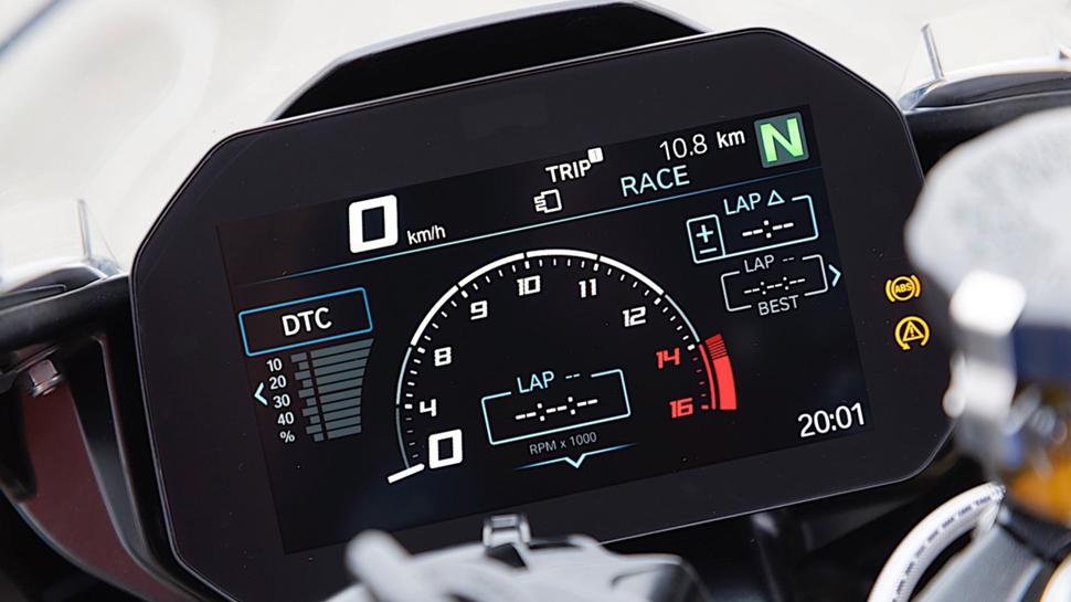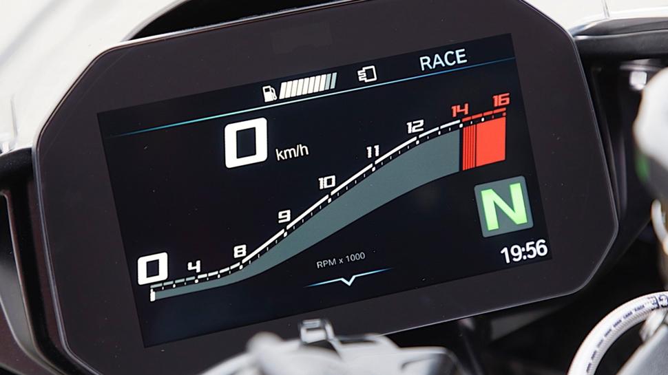 На переднем обтекателе Bmw S1000RR имеется выпуклое лобовое стекло, под которым разместился отлично читаемый, 6.5-дюймовый, цветной TFT-экран. Клипоны располагают к гоночной посадке, а если попытаться ехать в вертикальном положении, то начинают затекать запястья, плечи и начинает ныть шея.