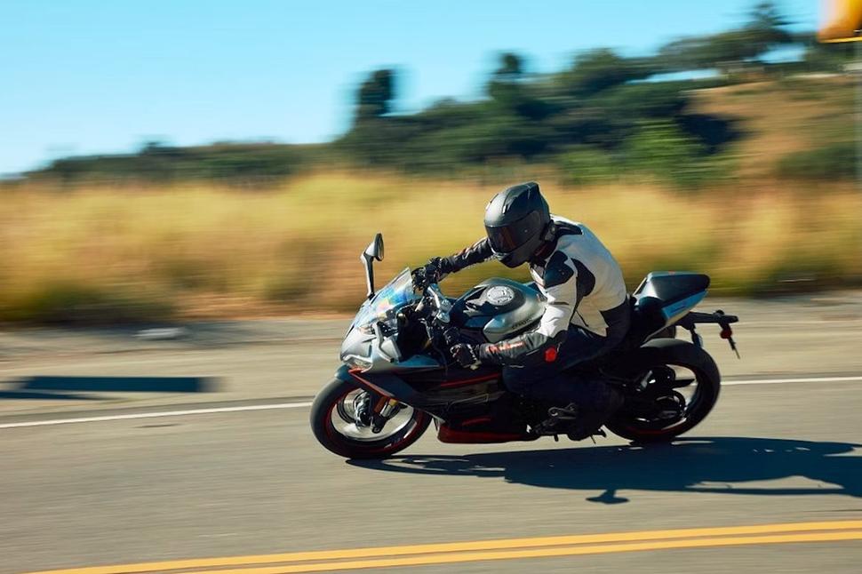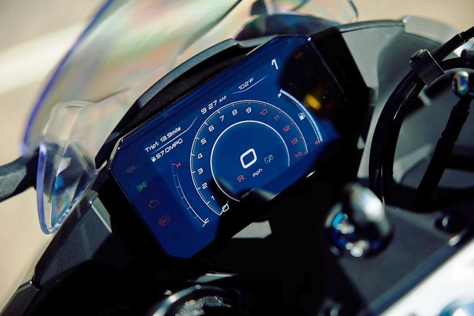 С полным 14-литровым баком мотоцикл весит 181кг. Вес и размер как раз такие, чтобы он не ощущался игрушечным, но и до полноразмерного спортбайка не дотягивает. Одна из областей, где CFMoto проявили излишне креативный подход - это посадка: клипоны расположены достаточно далеко, а подножки - высоко, так что посадка чересчур агрессивная, если не сказать неудобная. Более высокое опциональное сиденье делает мотоцикл просторнее.