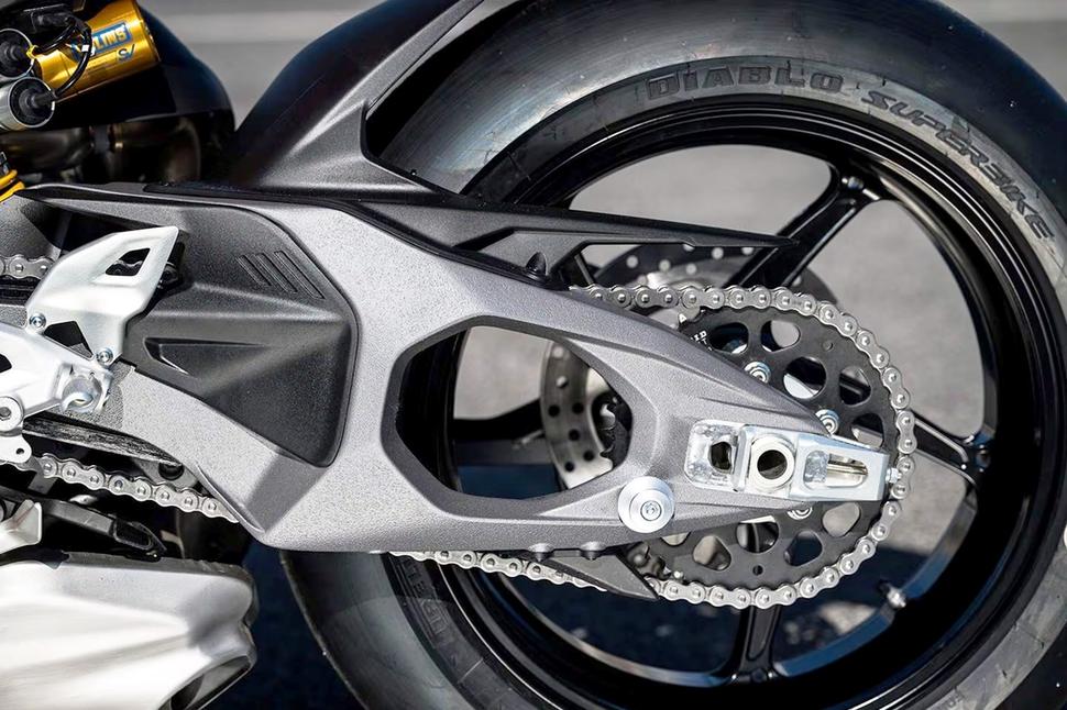 Во-первых, маятник. Ужасной для многих новостью стал отказ от односторонней конструкции, характерной для всех прошлых Panigale. Но что действительно любопытно, новый двухсторонний маятник показал снижение боковой жёсткости примерно на 37%.