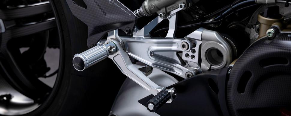 Разумеется, использование карбонового обвеса облегчает мотоцикл, благодаря чему вес этой модели составляет чуть меньше 173кг в снаряжённом виде, что почти на полтора кило меньше, чем у Ducati Panigale V4 S 2021 и на 2 с лишним меньше, чем у базовой модели V4. Из интересных особенностей стоит отметить фрезерованную алюминиевую ось рулевой колонки, регулируемые подножки, тоже из фрезерованного алюминия, и небольшие карбоновые пластины, защищающие пятки.