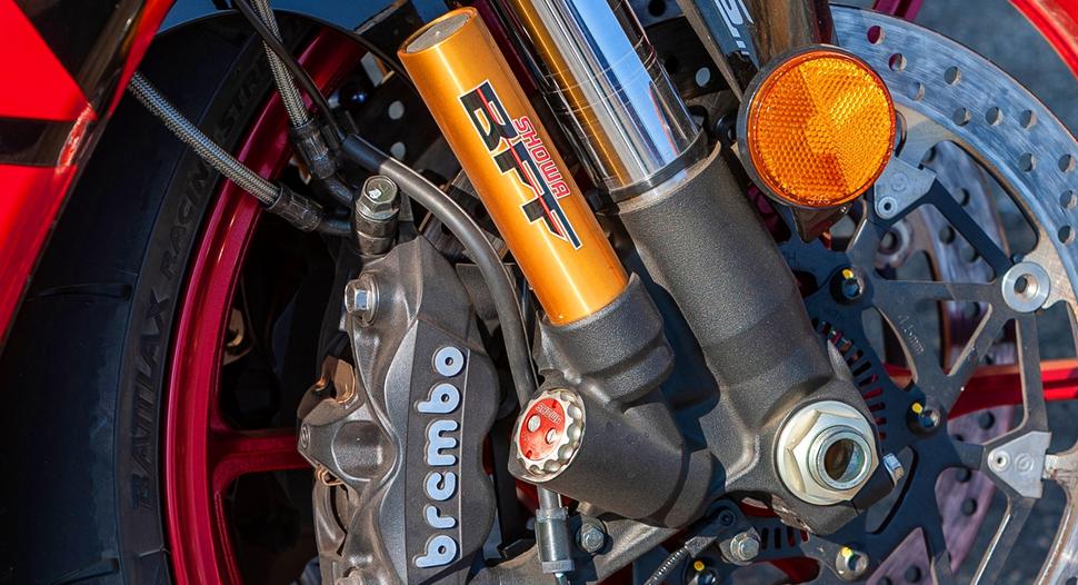 Любителям позолоченных шведских подвесок следующая мысль может показаться кощунственной, но японцы умеют делать вилки и амортизаторы. С газовым подпором (чтоб не пенилось масло) и раздельными схемами демпфирования, Balance Free FrontFork и Balanse Free Rear Cushion (да, Showa почему-то называет свои задние амортизаторы подушками) дают точно такую же превосходную чувствительность и обратную связь, как и подвески Öhlins - вилка NPX и амортизатор TTX36 на Ducati. Showa делает дороже премиум-версию GSX-R1000R на фоне варианта с одной буквой R, но возможно, Öhlins - одна из причин разницы в цене в 22 тысячи? Честно - вряд ли.