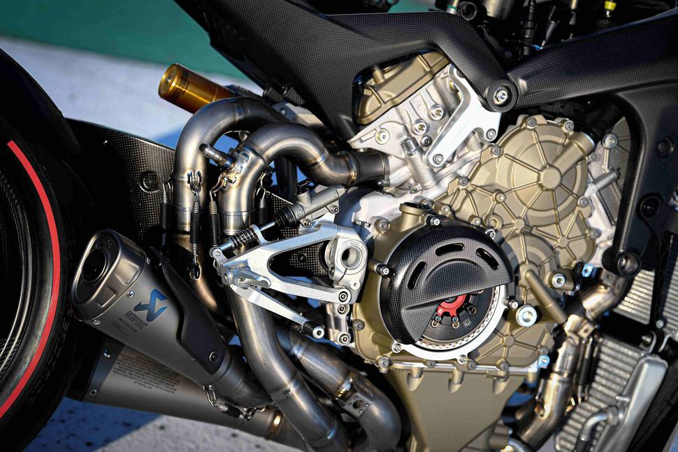 Так, 234 лошади становятся доступны при использовании Race Kit - титанового гоночного выхлопа Akrapovic и перепрошивки ЭБУ, да и измерялись они с коленвала - так что эта цифра не так важна, если вы не планируете ставить 998-кубовый двигатель Desmosedici Stradale R в какое-нибудь устройство с прямым приводом. Когда он стоит в мотоцикле, мощность проходит через трансмиссию (и паразитный вал, поскольку в V4 коленвал крутится в обратную сторону), а затем через конечную передачу. Обычно всё это отъедает около 10%, но даже за вычетом 24 лошадей Superleggera выдаёт больше двухсот с колеса на 15250 оборотов в минуту.