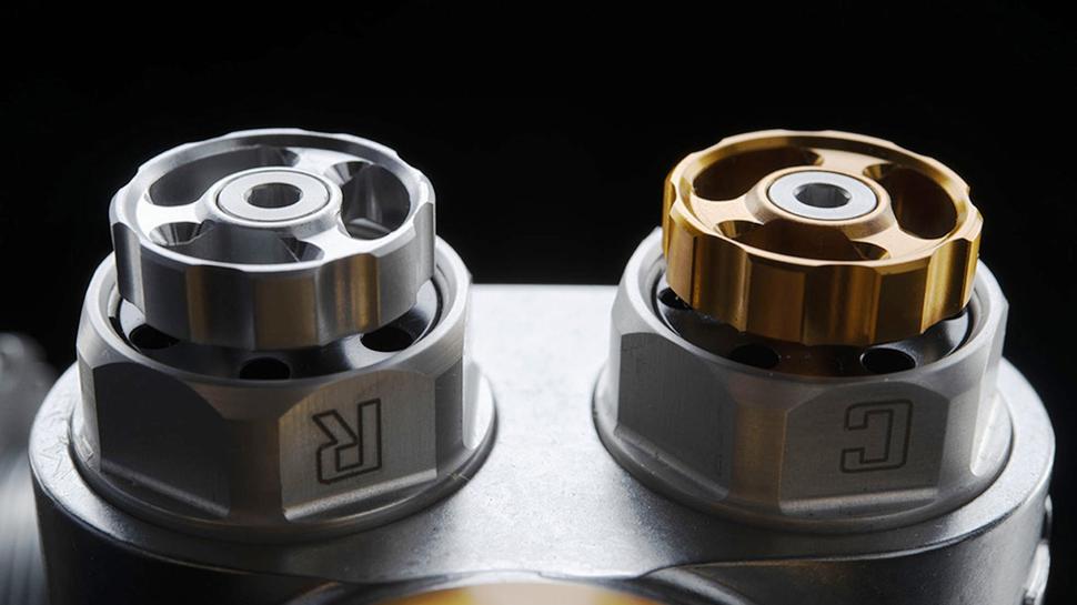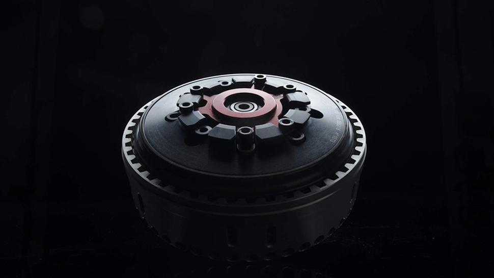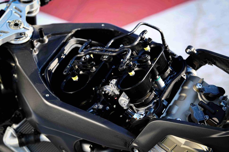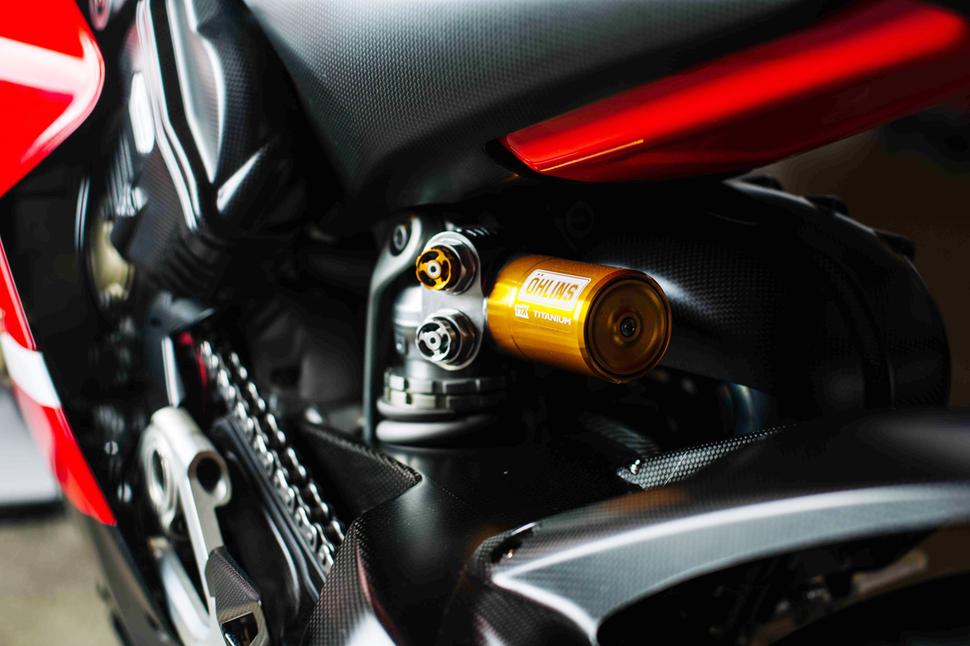 Затем - карбоновые колёса и обвес, титановые гайки звёзд и оси, пружина амортизатора. Да, пружина заднего Ohlins TTX36 сделана из титанового сплава с совершенно другим коэффициентом упругости, чем у стали, из-за чего потребовалась полная перенастройка сглаживания. Газовая вилка NPX25/30 имеет облегчённые фрезерованные днища. Фрезерованные подножки, траверсы и множество других элементов тоже вносят свой небольшой вклад в снижение веса. Даже поршни в новых суппортах Brembo Stylema R перфорированные, как и кулачки распредвалов в десмодромном приводе, как и барабан переключения передач в коробке.