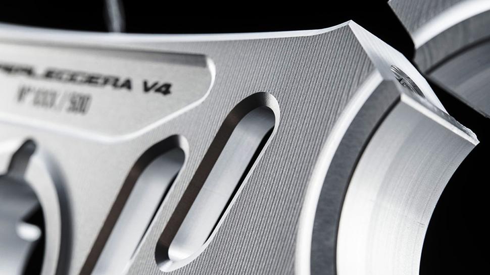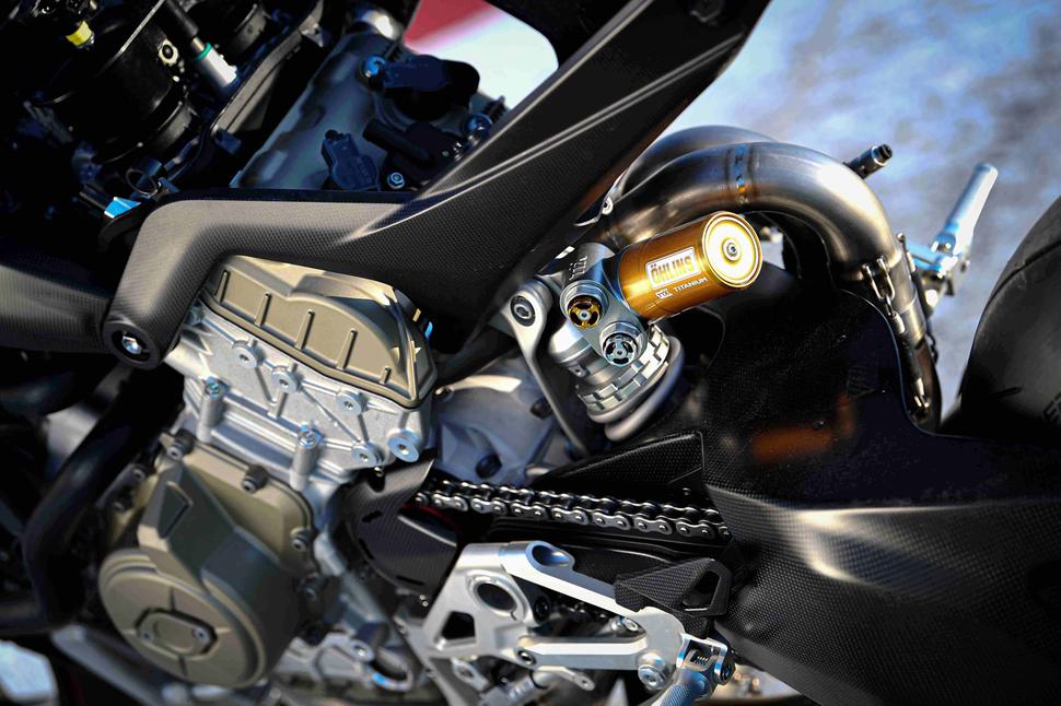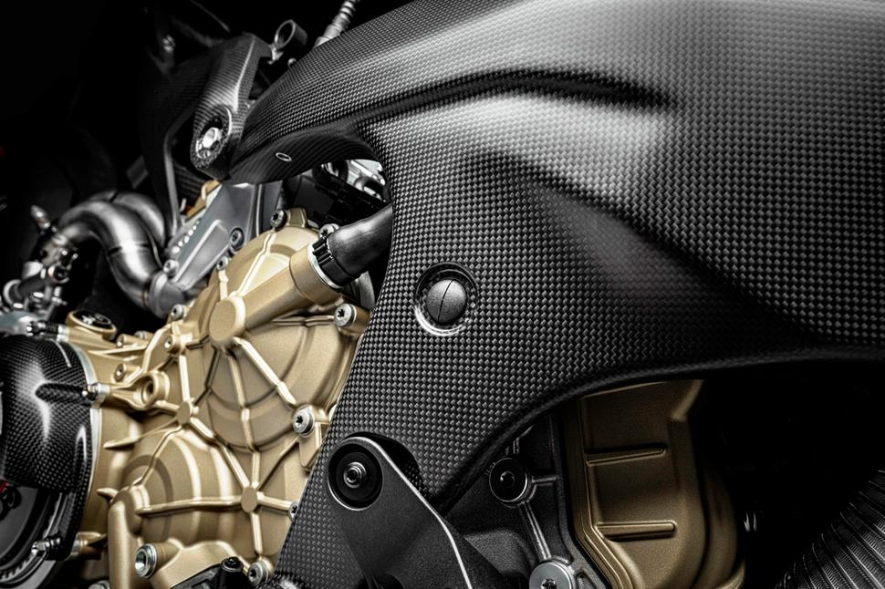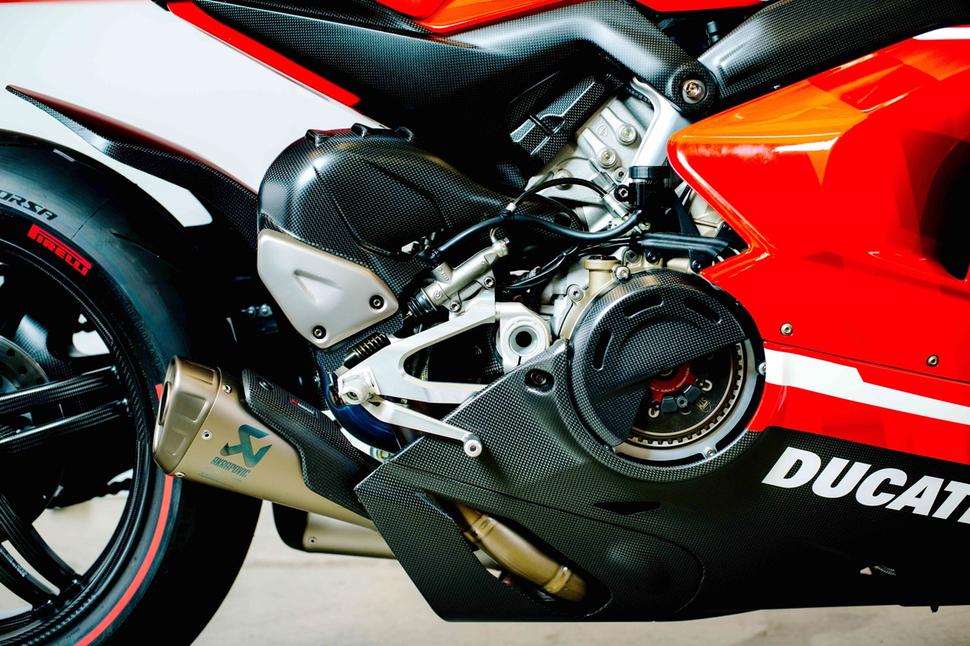 Двигатель, который уже был оснащён магниевыми крышками и титановыми шатунами и впускными клапанами, в Superleggera V4 R оснащён титановыми и алюминиевыми метизами. Выхлоп Akrapovič, подходящий под эконормы Euro4, экономит ещё 2 кило, но переход на полный гоночный выпускной тракт Akrapovič, который идёт в комплекте с каждой Superleggera, позволяет сэкономить ещё 3 с лишним килограмма и разблокировать дополнительные 25 лошадок.